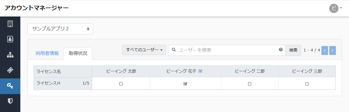 「取得状況」タブが表示される場合は、アプリケーションを利用するためにライセンスを取得しているユーザーの確認を行うことができます。