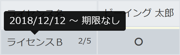 ライセンスの利用ユーザーは、対象欄が”○”で表示され、利用していないユーザーは”×”で表示されます。