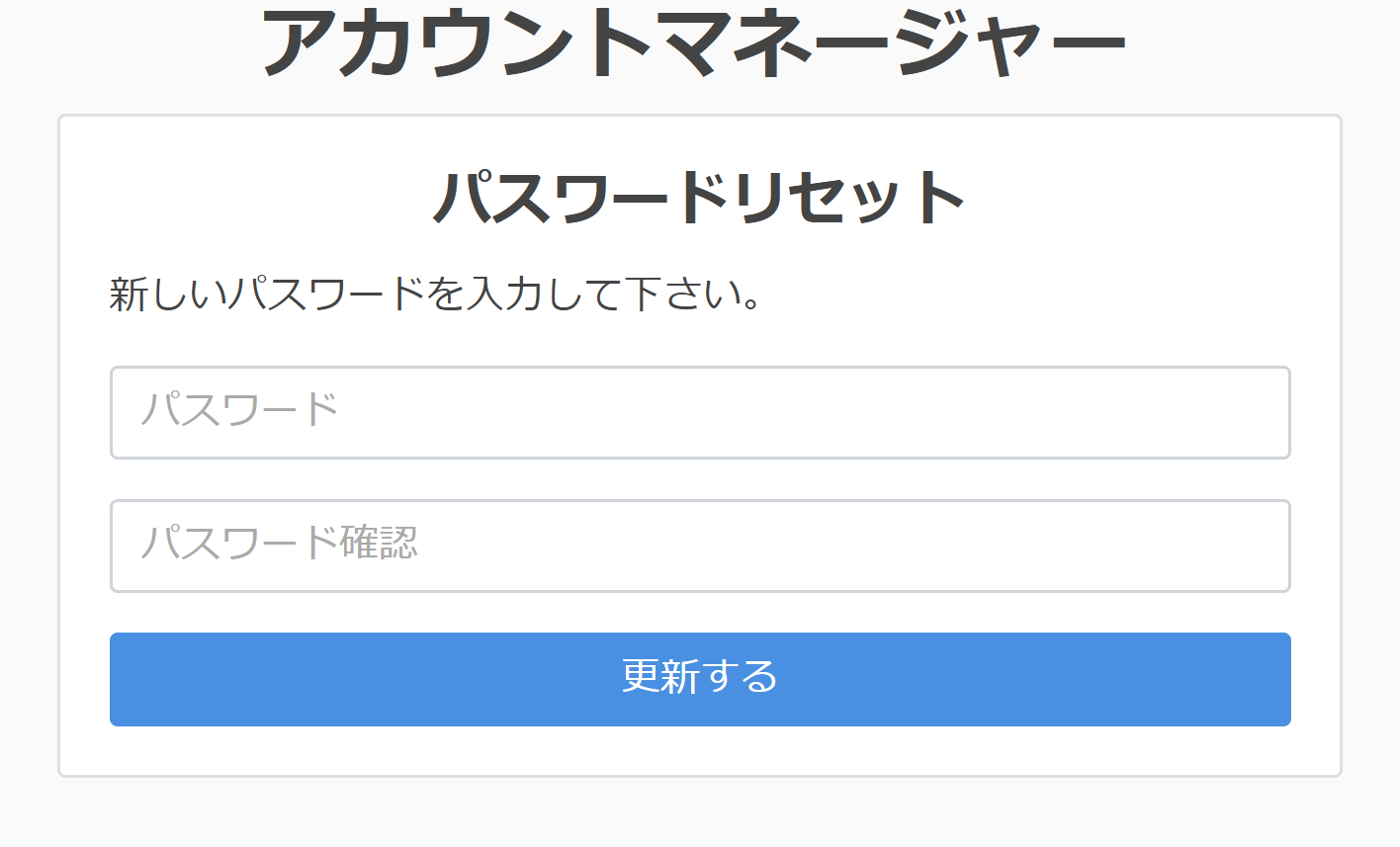 パスワードとパスワード確認欄にパスワードをご入力後、「更新する」ボタンをクリックするとパスワードの再設定が完了します。ログイン画面へ遷移しますので、そこからログインを行って下さい。