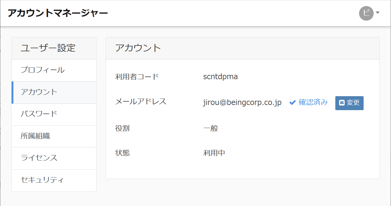 アカウントの情報を確認するには、ユーザー設定メニューの「アカウント」をクリックして下さい。