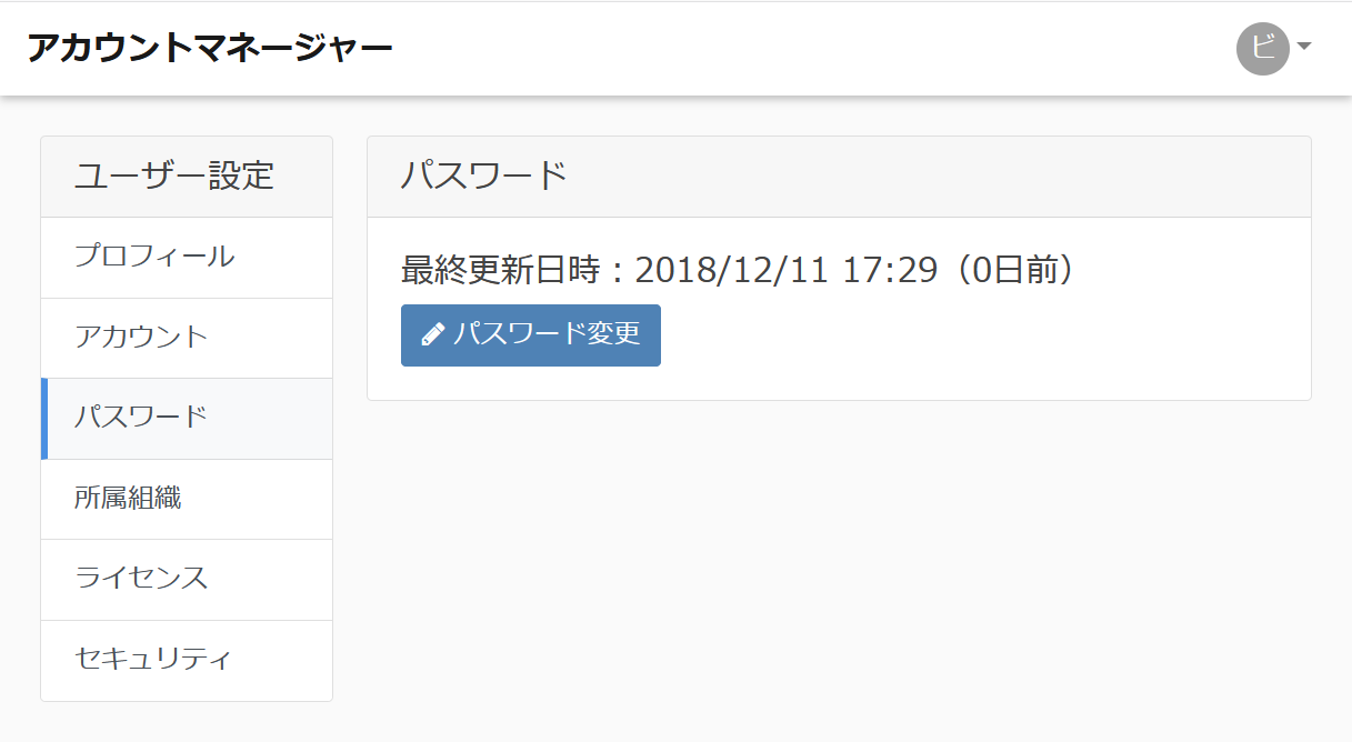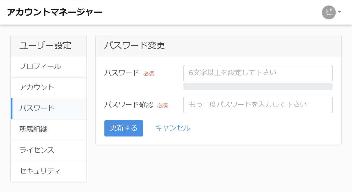 パスワードを変更するにはユーザー設定メニューの「パスワード」をクリックしてパスワードへ進んで下さい。