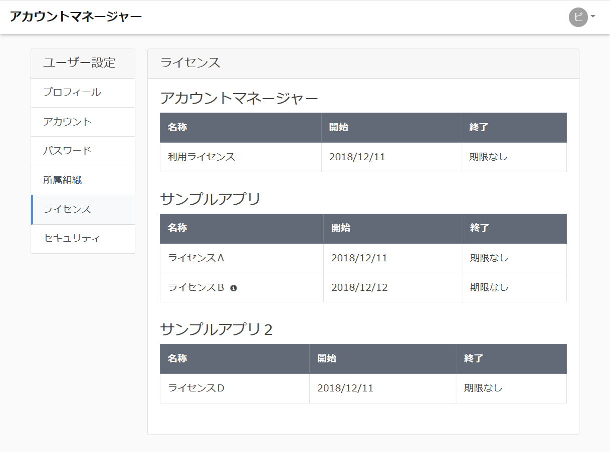 ここではアプリケーションごとのライセンス名、ライセンスの利用開始日、ライセンスの利用終了日を確認することができます。